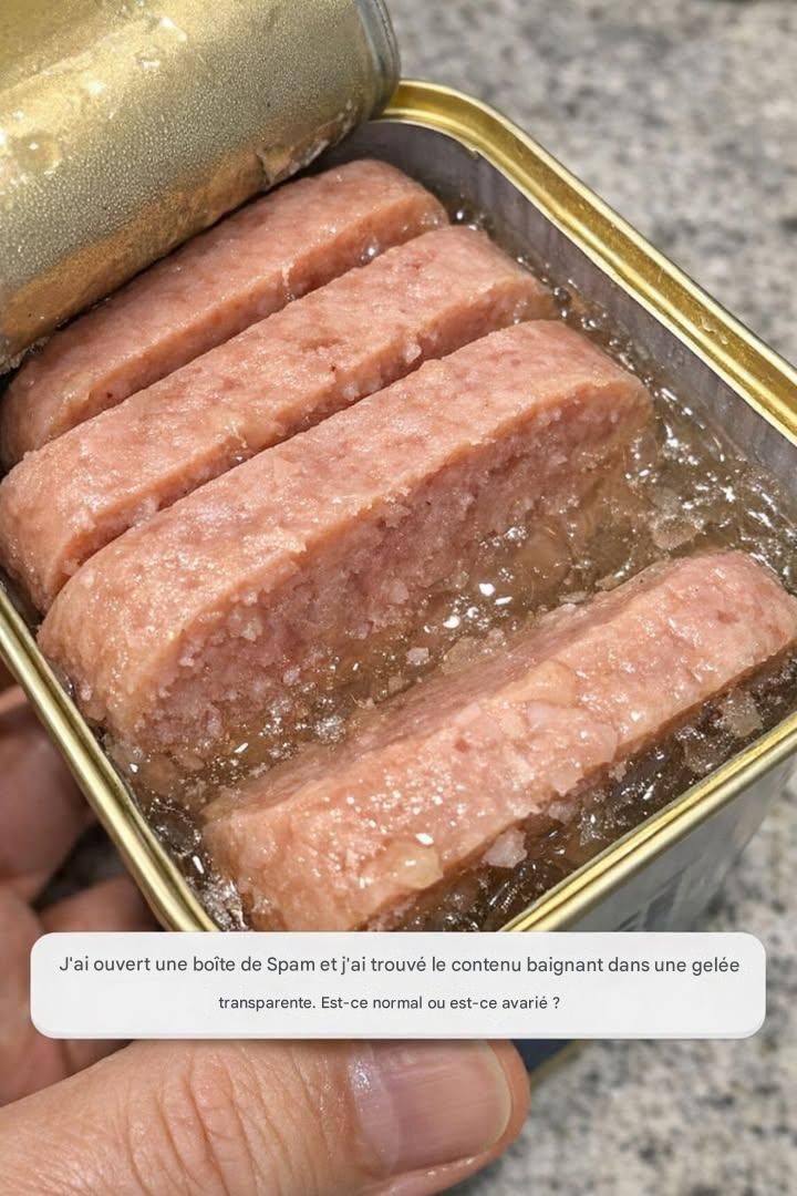 J’ai ouvert une boîte de Spam et j’ai trouvé le contenu baignant dans une gelée transparente. Est-ce normal ou est-ce avarié ?