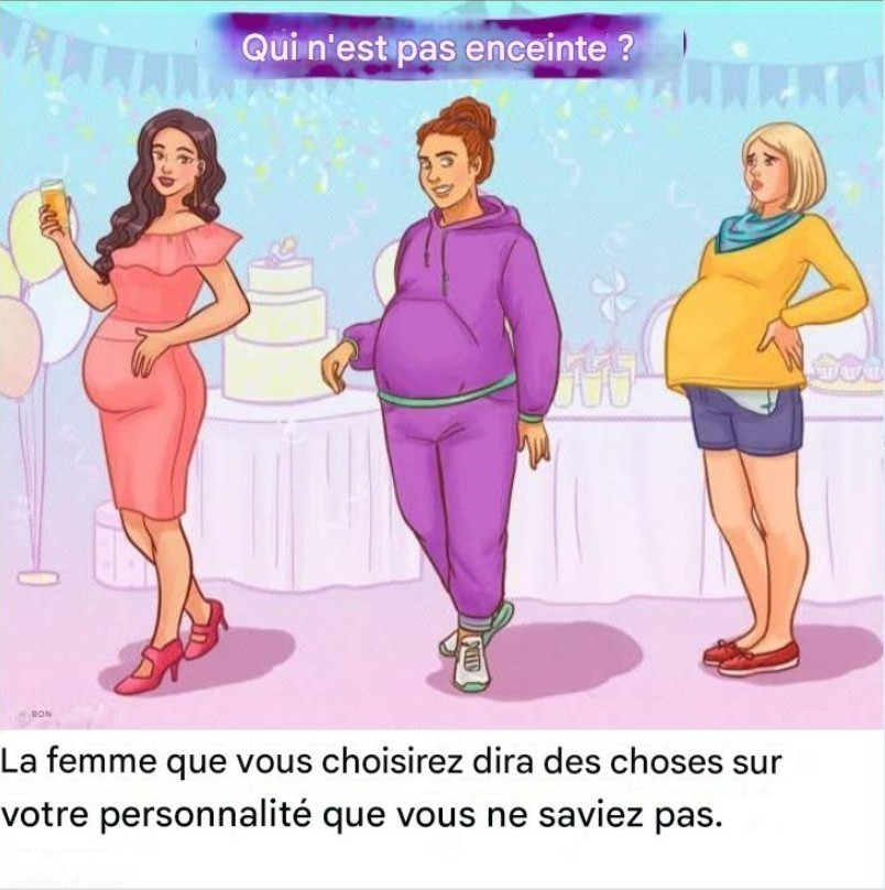 Le casse-tête d’aujourd’hui est simple mais délicat : sur trois femmes, une n’est pas enceinte. Votre tâche consiste à repérer qui il s’agit en 5 secondes.