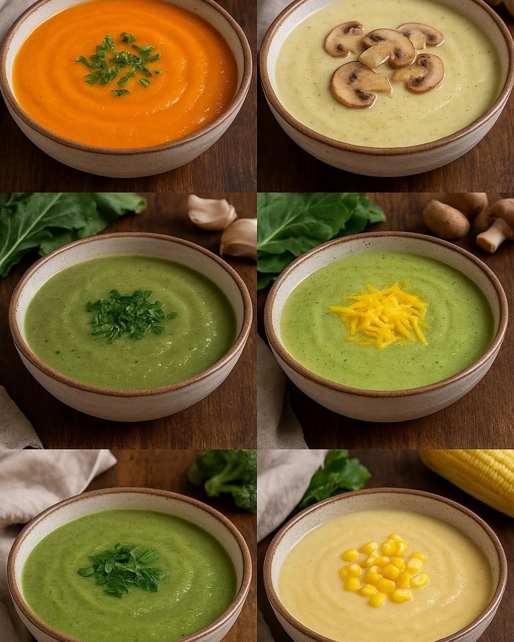 Nettoyer et émincer les champignons. Les faire revenir avec l’oignon et une gousse d’ail jusqu’à ce qu’ils soient dorés. Réserver un peu pour la garniture. Mélanger le bouillon restant avec la moitié de la crème et un filet de bouillon de légumes ou de lait. Remettre le mélange dans la casserole avec un peu de beurre, porter à frémissement à feu doux, saler et poivrer. Garnir avec les champignons réservés.