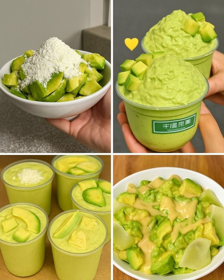 Garnitures au choix : nata de coco, gelée d’herbe, perles de tapioca, cubes d’avocat, durian (facultatif)