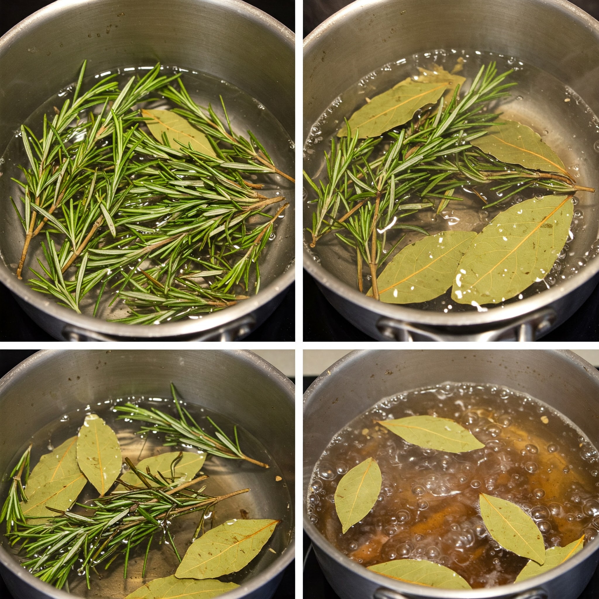 2 à 4 brins de romarin (ou 2 cuillères à soupe de romarin séché) : Le romarin aide à éliminer les pellicules, possède des propriétés antibactériennes, ajoute du volume et de la brillance aux cheveux.