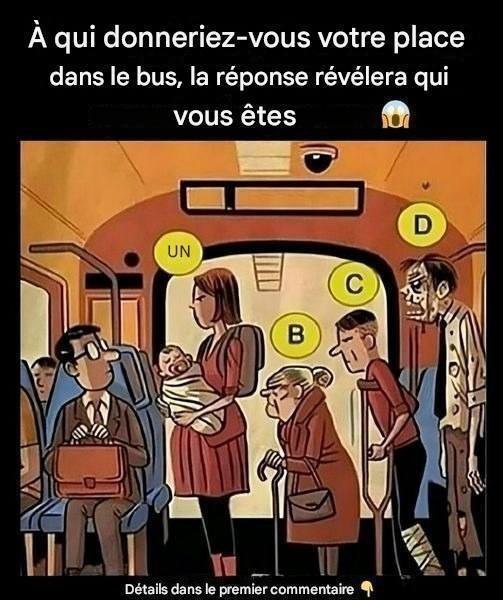 Imaginez que vous êtes dans un bus bondé avec un siège libre et que quatre personnes ont visiblement besoin d’aide. Les circonstances de chaque personne sont différentes et votre choix pourrait révéler des facettes distinctes de votre personnalité et de vos valeurs. Examinons chaque option :
