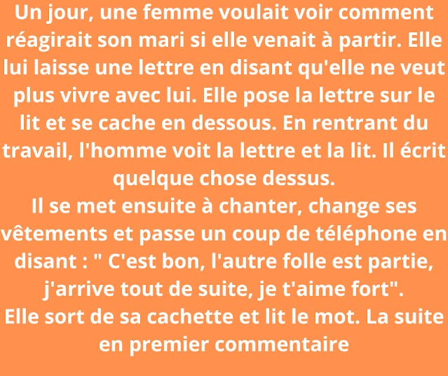 Un jour, une femme voulant voir comment réagirait son mari si elle venait à partir. Elle lui laisse une lettre en disant qu’elle ne veut plus vivre avec lui. Elle pose la lettre sur le lit et se cache en dessous. En rentrant du travail, l’homme voit la lettre et la lit. Il écrit quelque chose dessus.