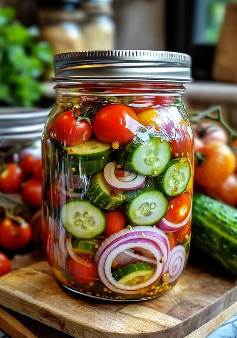🧅🍅🥒 Envie de quelque chose de frais et acidulé ? Ce mélange de légumes marinés facile à préparer est la solution parfaite ! C’est un moyen rapide d’ajouter du croquant et de la saveur à n’importe quel repas, que vous le serviez sur une salade, un sandwich ou que vous le dégustiez simplement directement du pot. Ce dont vous aurez besoin : – 1 pinte de tomates cerises (laissez-les entières ou coupées en deux) – ½ oignon rouge, finement tranché – ½ concombre, finement tranché – 1 tasse de vinaigre blanc – ½ tasse d’eau – ¼ tasse de sucre – 1 cuillère à café de sel – ½ cuillère à café d’origan séché – ¼ cuillère à café de flocons de piment rouge – ¼ tasse d’aneth frais, haché Comment le faire : 1. Préparez les légumes : Ajoutez les tomates cerises, l’oignon émincé et le concombre dans un bol ou un bocal. 2. Préparez la saumure : Dans une petite casserole, mélangez le vinaigre, l’eau