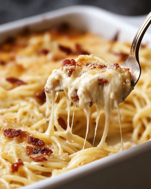 Les spaghettis au fromage frais et bacon cuits au four sont un de ces plats réconfortants qui nous font l’effet d’une douce étreinte après une longue journée. Ayant grandi dans le Midwest, les gratins étaient un incontournable à la maison, et cette recette est une délicieuse variante du classique spaghetti cuit au four. Elle est parfaite pour les soirs de semaine chargés où l’on a envie de quelque chose de copieux et de satisfaisant sans passer des heures en cuisine. La texture fondante et filante du fromage, associée au bacon fumé, la rend irrésistible. De plus, c’est une excellente façon d’utiliser les restes de spaghettis ou de bacon que vous avez peut-être au réfrigérateur.