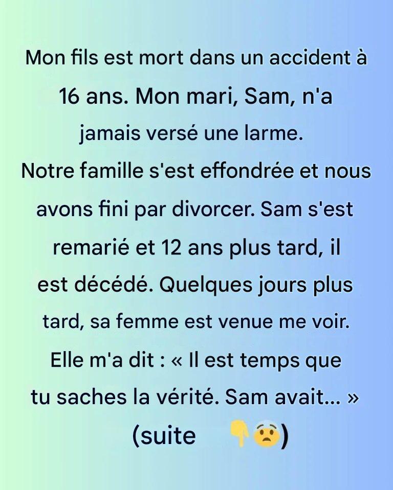 J’ai perdu mon fils dans un accident tragique à l’âge de 16 ans. Mon mari de l’époque, Sam, est resté distant, sans jamais montrer d’émotion. Notre famille n’a pas résisté à cette perte, et nous avons divorcé. Des années plus tard, Sam est décédé. Quelques jours après, sa femme actuelle est venue me voir.