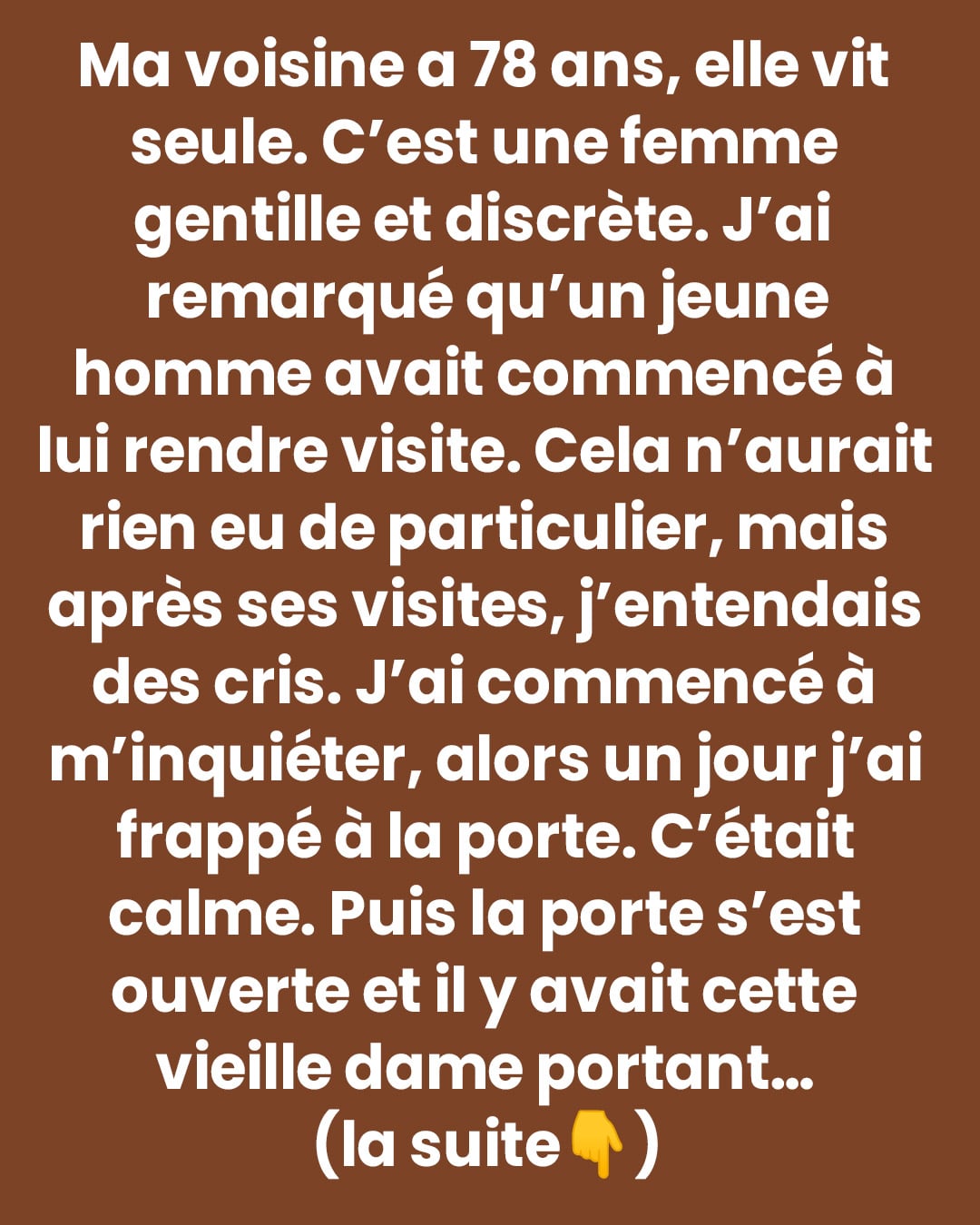 Depuis longtemps, Madame Dupont – une retraitée de 78 ans, veuve et sans famille proche – habitait seule son petit appartement. Discrète et toujours courtoise, elle représentait pour son voisin Thierry l’archétype de la personne âgée paisible. Jusqu’à ce jour particulier où, alors qu’il s’occupait de ses plantes sur le balcon, un son étrange l’a interpellé : des cris étouffés mais distincts provenaient du logement voisin. Une vague d’inquiétude l’a submergé. Se pouvait-il qu’elle soit en difficulté ? Sans réfléchir, il s’est dirigé vers sa porte d’entrée.