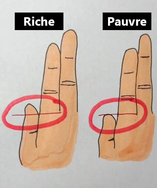 Une main, intitulée « Riche », présente un annulaire sensiblement plus long que l’index. L’autre, intitulée « Pauvre », présente un index égal ou plus long que l’annulaire.